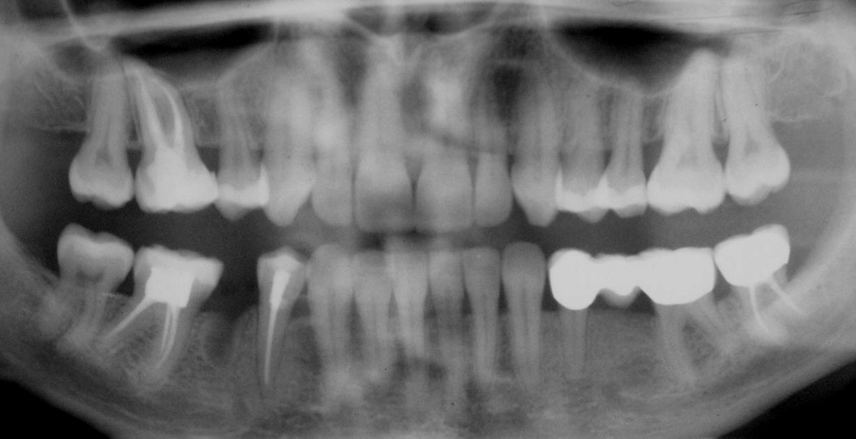 OPT anlässlich der Erstuntersuchung im November 2004: Zustand nach Ex 45, unauffälliger Wurzelbehandlung an 16, unvollständige WF mit diskreter Beherdung an 46, unauffällige WF an 44 mit deutlich verbreitertem PAR-Spalt (Klick!)