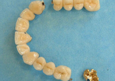 Im Brücken-Verbund mit weiteren starken Pfeilern sind das sicher brauchbare Pfeilerzähne. Insbesondere wenn bis zum Knochen präpariert wird, damit die Zahnstümpfe tief und eng gefasst werden können und in der Folge möglichst wenig Last auf den Stiftaufbauten liegt. Um ein Freiendglied zu tragen, noch dazu in der ungünstigsten aller Konstellationen, nämlich Pfeiler 13, Brückenglied 14, Pfeiler 15 und Brückenglied 15, sind diese „natürlichen Implantate“ über die Maßen frakturgefährdet. Und mit Ihnen die ganze Versorgung.