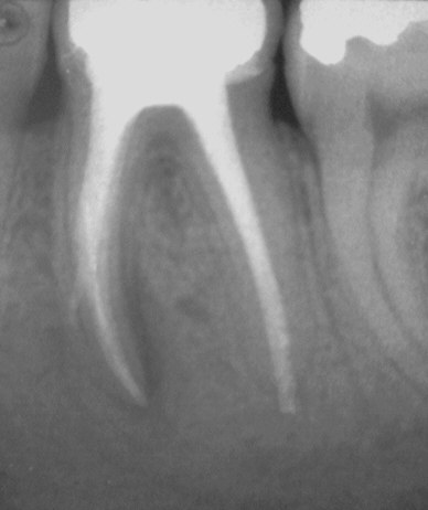Messaufnahme während der Revision unter Erhalt der Restauration bei via falsa und abgebrochenem Instrument im anderen Kanal im August 2002 (Klick!)