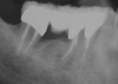 Beachtenswert ist insbesondere der „wundersame Knochengewinn“ im Bereich der mesialen Wurzel von 47 und interdental 45/46 im Vergleich zum Ausgangsbefund. Sehr deutlich wird auch die Reduktion der Parodontalspalten in der Folge der Eliminierung der Entzündung und der schützenden Ruhigstellung durch die primäre Verblockung