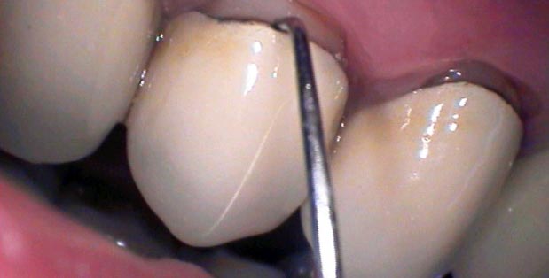 Wenn man jedoch einmal genau und mit neutralem Blick hinschaut, sieht man deutlich, dass es sich nicht zwangsläufig um eine primär insuffiziente zahnärztlich-technische Verrichtung des Vorbehandlers handeln muss, sondern dass es sich vielmehr mit hoher Wahrscheinlichkeit um ausbrechende Zahnhälse handelt. Davor schützen also auch Kronen nicht. Wie sollten sie auch? Die Wahrscheinlichkeit, dass es so ist, wird noch größer, wenn man weiß, dass es sich bei dem Patienten und einen besonders ambitionierten Geschäftsmann handelt, dessen Unternehmen am neuen Markt gelistet ist. Tagsüber trägt er die Schiene offensichtlich nicht.